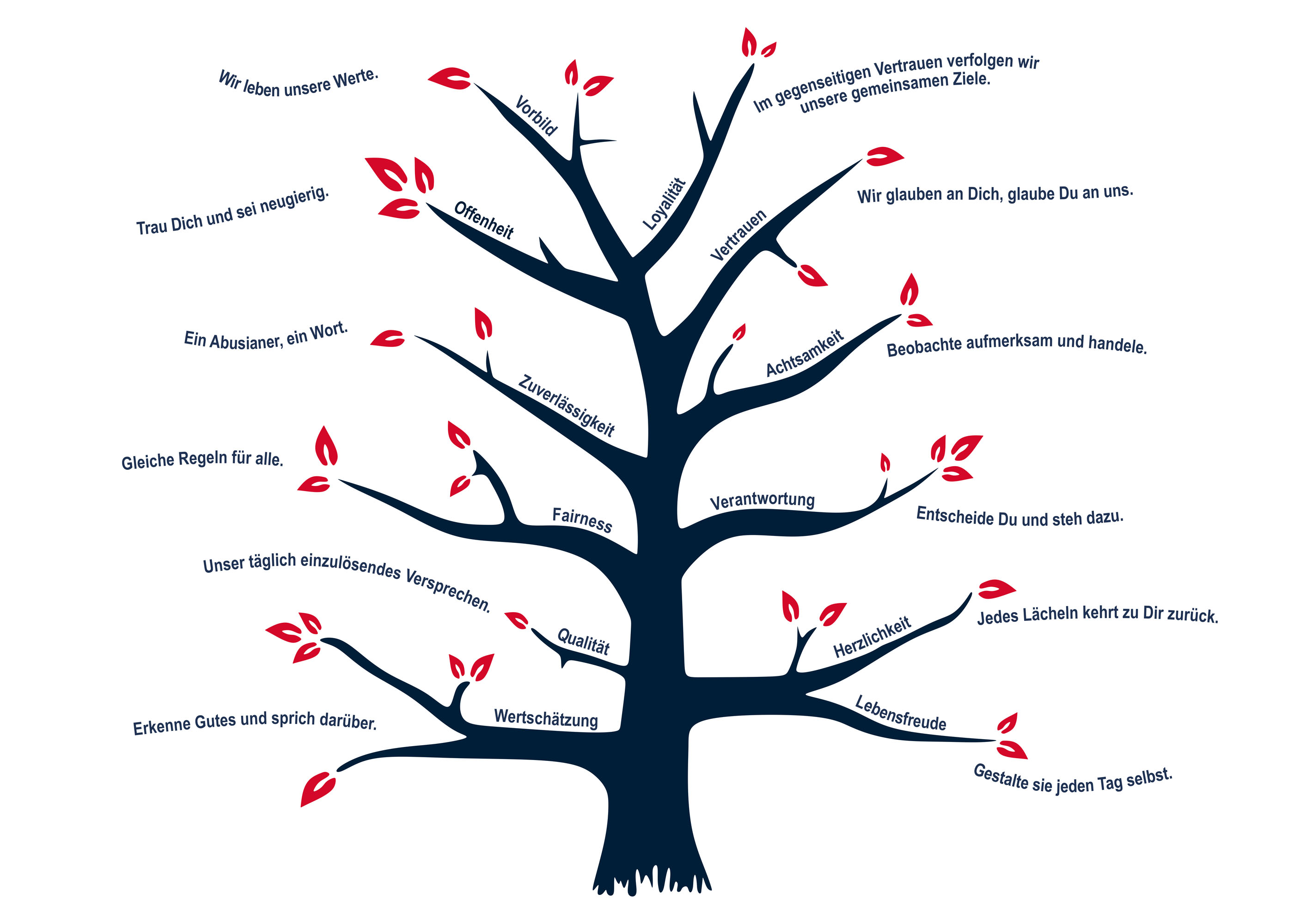 Diese Haltung lebt weiter in unserem ABUS Wertebaum, der die Vielfalt und Tiefe unserer Überzeugungen sichtbar macht. Begriffe wie Achtsamkeit, Fairness, Herzlichkeit und Lebensfreude stehen dabei nicht nur auf dem Papier, sondern werden tagtäglich mit Leben gefüllt.